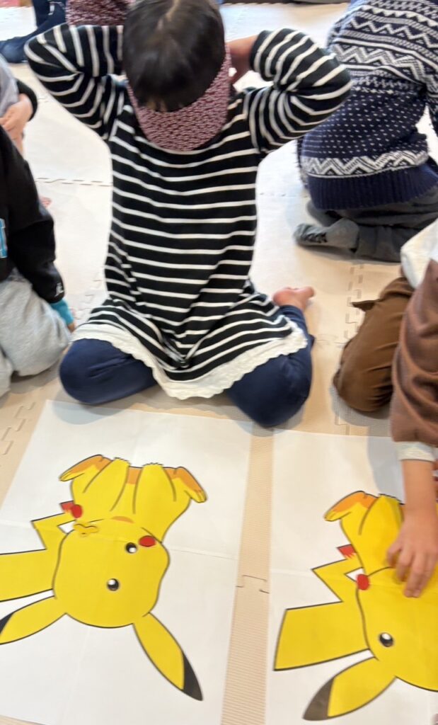 目かくしをするよ✨、見えないままで目やお口を並べていくよ。ズレちゃってもOK!!面白くできたら笑っちゃおう😊と説明してからのスタート!!