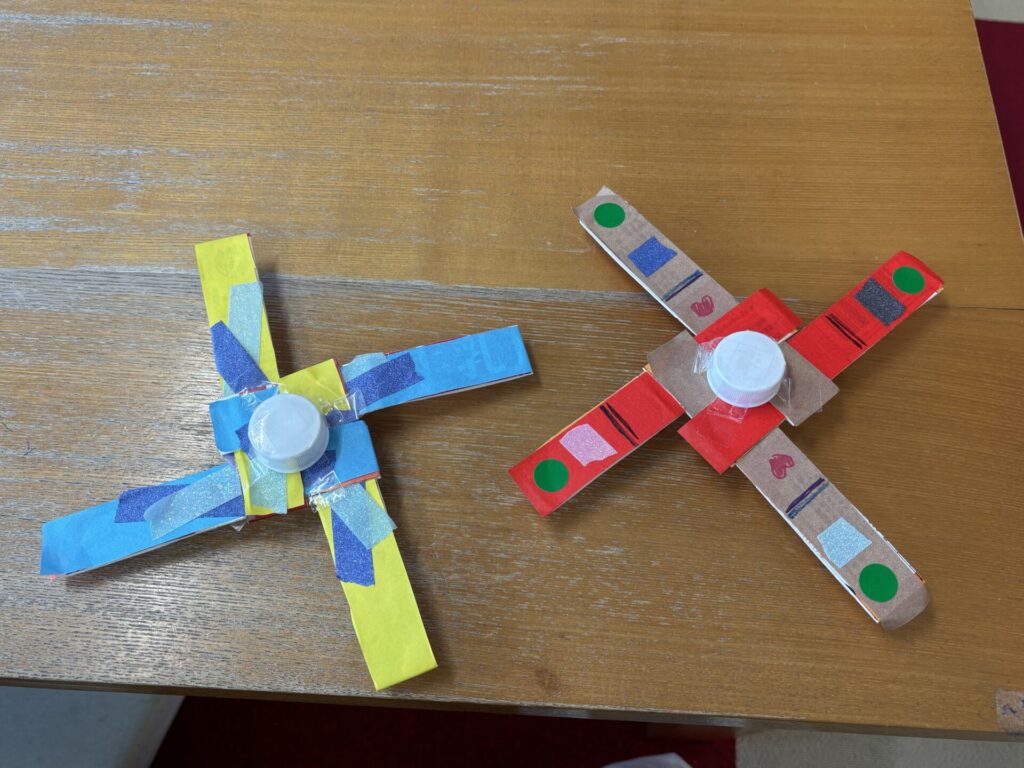 細く切った牛乳パックを組み合わせて、中央にペットボトルのキャップを付ければ完成✨